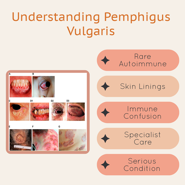 Pemphigus vulgaris is a rare disease attacking your skin and inside linings. Picture your own immune system confused, assaulting what it should protect. Unlike common rashes, this is a serious problem requiring special knowledge.